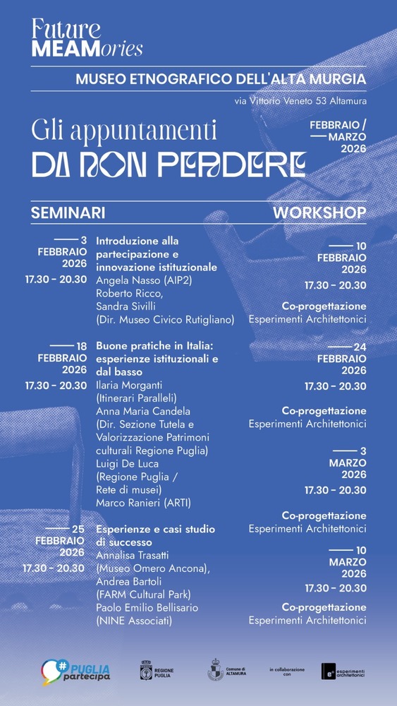 In un'epoca di profonda trasformazione del ruolo dei presidi culturali, il seminario approfondisce come l’innovazione istituzionale possa diventare il motore per il rilancio del Museo Etnografico dell’Alta Murgia (MEAM).