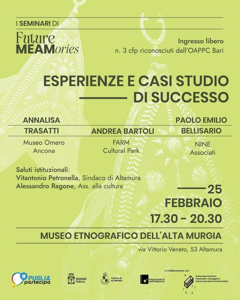 Il percorso partecipativo Future MEAMories prosegue il suo cammino di rigenerazione culturale con un appuntamento dedicato all'ispirazione e al confronto con l'esterno. Questo incontro mira a fornire nuove lenti di ingrandimento per osservare il potenziale del Museo Etnografico dell'Alta Murgia, partendo da modelli che hanno saputo trasformare i territori attraverso l'arte e l'inclusione.