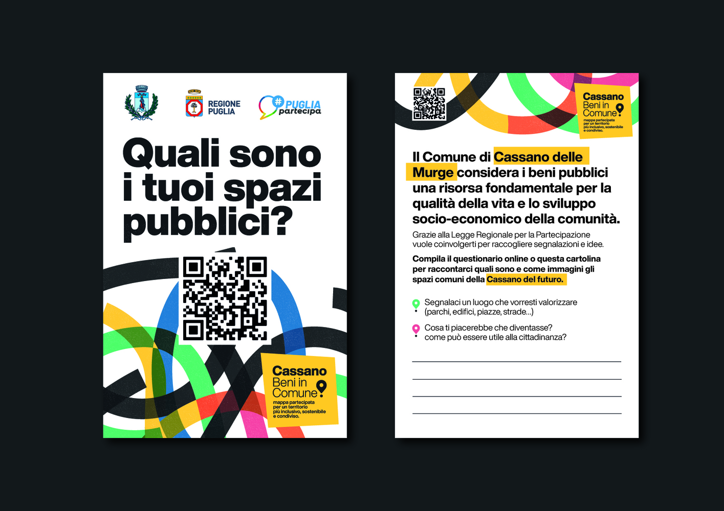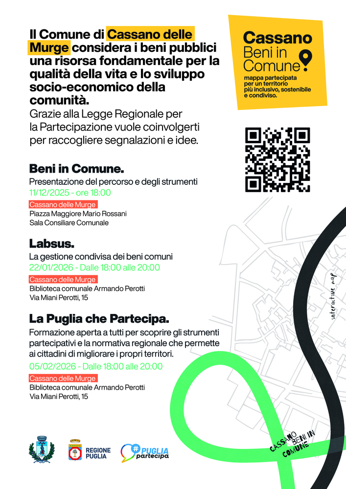 Tramite il progetto "Beni In Comune", la Città di Cassano delle Murge intende mappare i beni pubblici presenti sul territorio per rinnovare l’intento di valorizzare e mettere a disposizione delle idee dei cittadini i luoghi mappati. L’obiettivo è quello di aggiornare e rinnovare il processo sulla rigenerazione urbana denominato svolto nel 2015 e chiamato “Cassano 2020”.
